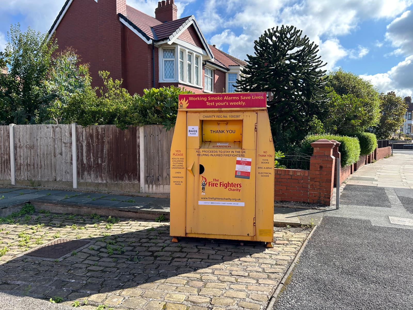 Recycling your clothing and footwear at this bank supports The Fire Fighters Charity.