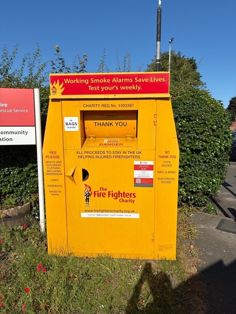 Recycling your clothing and footwear at this bank supports The Fire Fighters Charity.